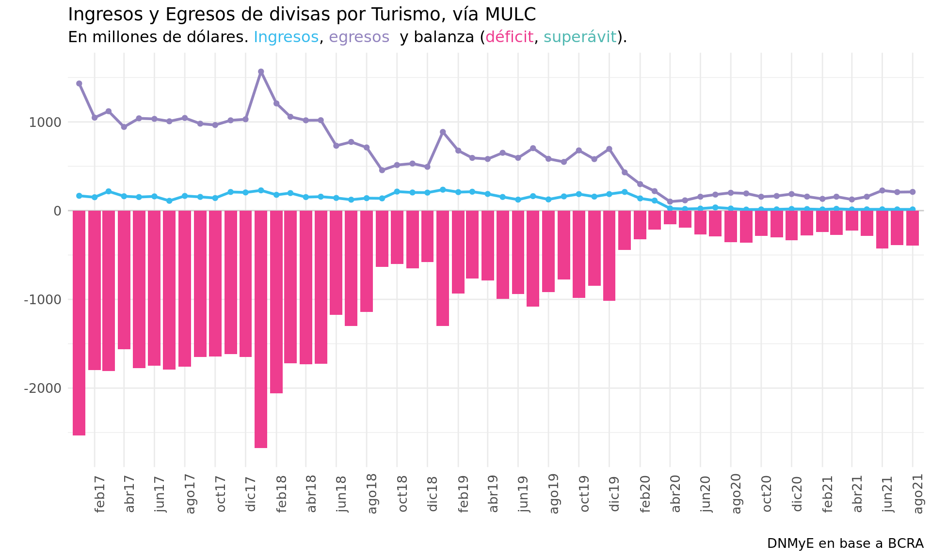 Ingresos y egresos de divisas vinculados al turismo en el mercado oficial de cambios.